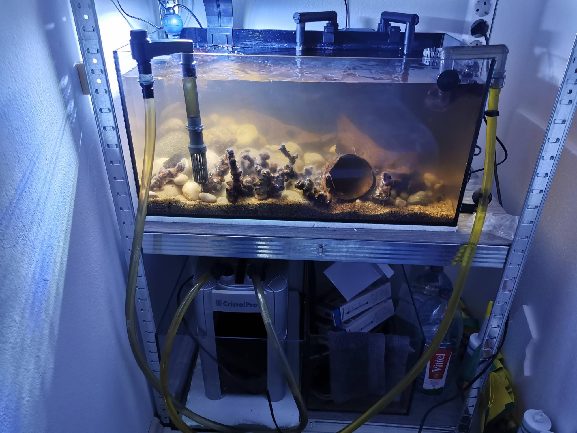 Da ne ostanem duzan i ovde :) Mali update! Dodat jos jedan akvarijum na policu a 240L dopunjen sa dragonstone i potopljen. Za sada samo vrti vodu i tako ce biti vrv do sledeceg vikenda kada planiram presadjivanje biljaka.
