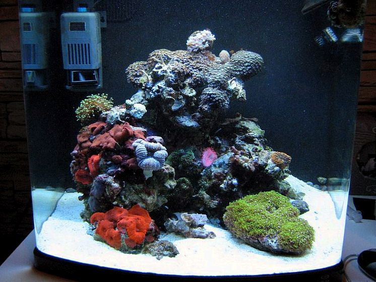 U akvarijima većim od 20 litara sa nešto većom količinom živog kamena i eventualno manjim skimerom, mogla bi se staviti i pokoja riba s tim da u 100 litara nebi trebalo biti više od 4-5 riba. Što se koralja tiče, izbor se može proširiti na otporne tvrde koralje sa dugim polipima kao sto je caulastrea i slično, s time da se pazi na udaljenost između koralja da se nebi međusobno pržili. U malom sistemu voda se brzo ispuni otrovima koji ispuštaju napadnuti koralji i zagadi. I neki tvrdi koralji sa kratkim polipima vrlo se dobro snalaze u malim sistemima. Npr. neke vrste pocilopora, stilopora i seriatopora. Naravno ima i malih sistema u kojima uspjevaju i kompliciraniji SPS koralji, ali zahtjevaju i veliku discipliniranost, znanje i rutinu prilikom održavanja. Kako litraža raste može se ubaciti i pokoja riba. I to ribe kao sto su klauni, chromisi, firefishevi te razne vrste malih gobyja koji su kao stvoreni za nano akvarije i jedini od ovih nabrojenih riba koje će se u malim sistemima donekle dobro snaći. Kod hranjenja riba vrijedi pravilo da je bolje ubaciti vrlo malo hrane više puta na dan nego jedanput puno. Ne ubacujte puno riba, pazite na kompatibilnost, ne miješajte agresivne i mirne ribe i stvari bi trebale funkcionirati.